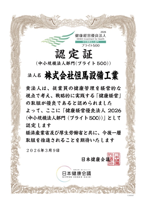 この度、株式会社但馬設備工業は、経済産業省と日本健康会議が実施する「健康経営優良法人2026(中小規模法人部門)」において、特に優良な健康経営を実践している企業として「ブライト500」に認定されました 。